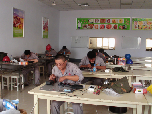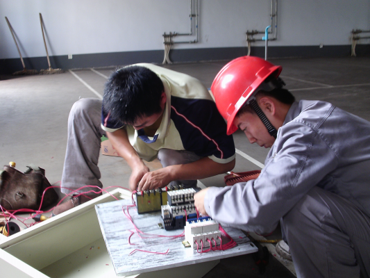 維修電工的比賽分為登桿和配電盤制作兩個項目,登桿比賽在東方陶瓷舊址進行,參賽選手們腳踏著腳扣,腰上系著保險帶,在上蒸下煮的酷熱天氣里,他們迅速登上電線桿安裝瓷瓶,然后再快速回到地面,整個流程結束,他們的衣襟已經濕透,在他們身上看到的的是嫻熟的操作速度和日積月累的操作水平。配電盤制作的比賽在華盛熱電娛樂室進行,參賽選手們爭分奪秒,他們忘記了天氣的溫度,每根線都被整整齊齊地接到各個電器元件和端子排上。比賽分為8組進行,兩人一組共同制作一個配電盤,選手們互相配合,互相借鑒,共同學習,把技術和經驗融入集體,出色地完成了此次比賽。